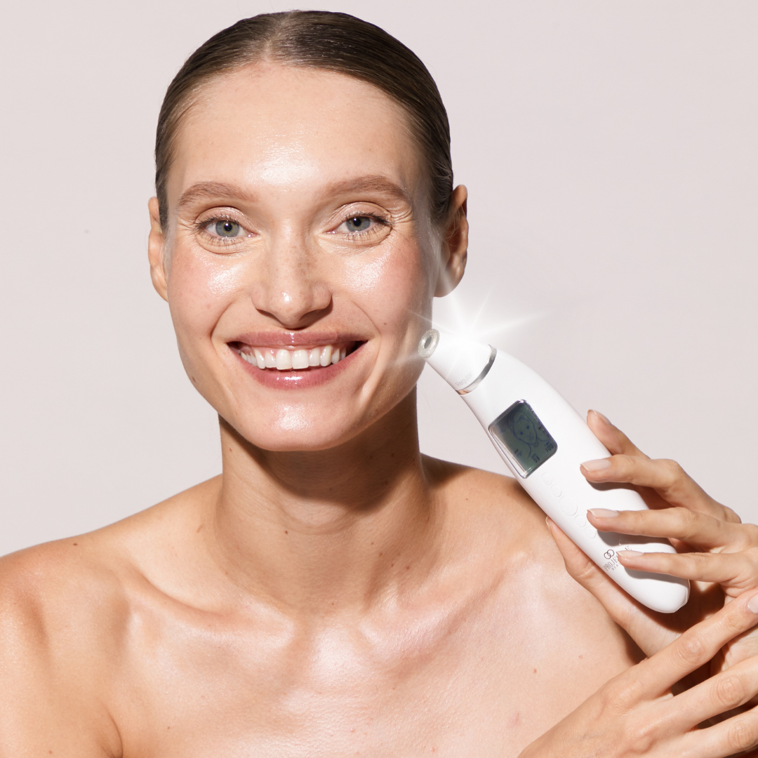 The lightweight handheld device combines microdermabrasion and vacuum therapy to deliver medical-grade exfoliation at home. This handheld tool functions to unclog congested pores, remove dirt, excess oil and dead skin cells lingering on the skin’s surface without stripping the skin barrier, and stimulate blood flow, for a clear, bright and even complexion.
